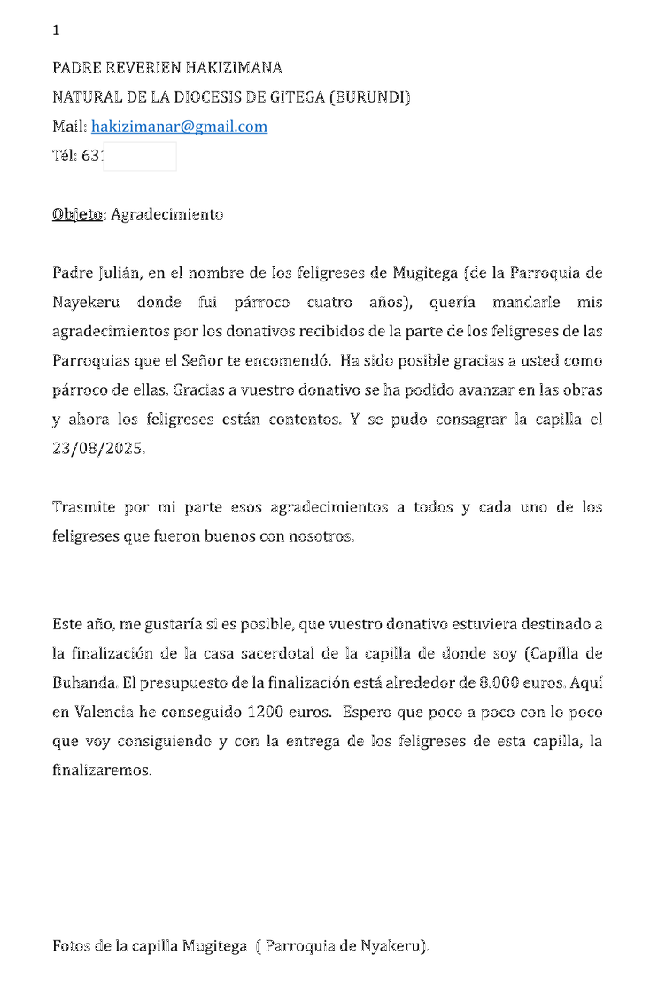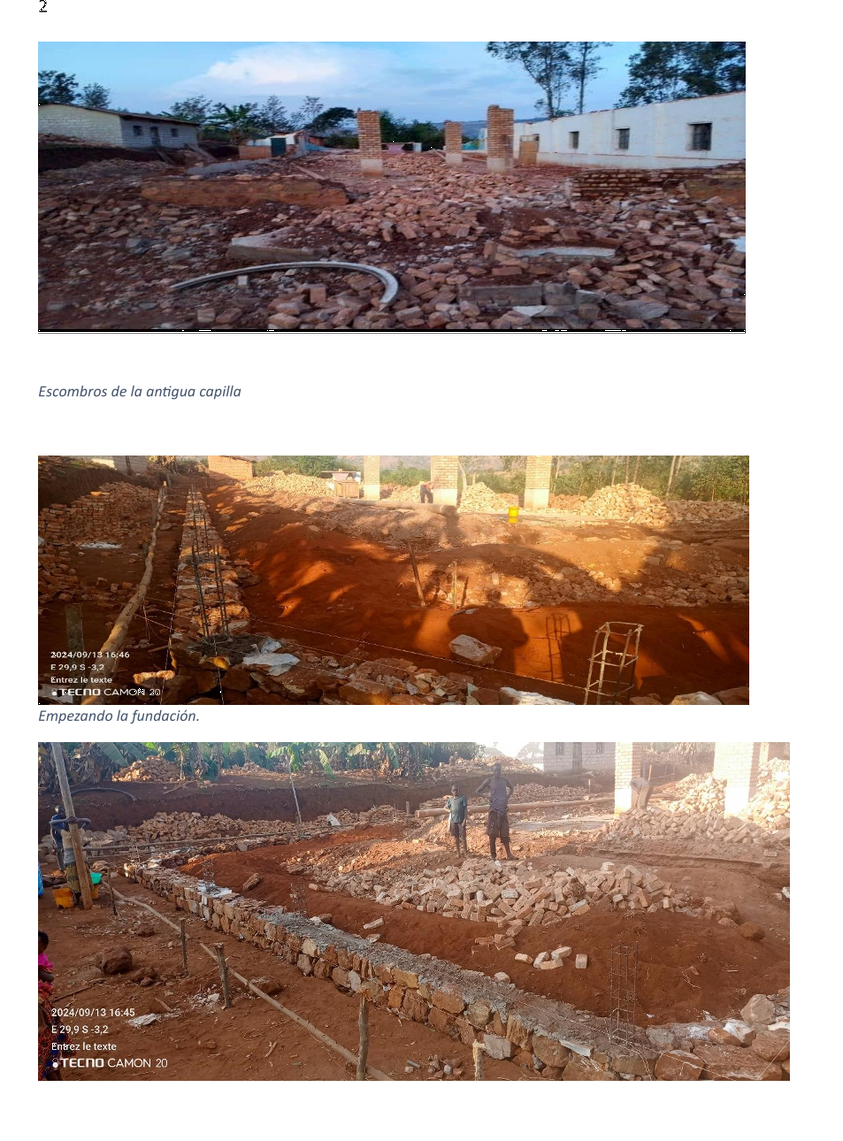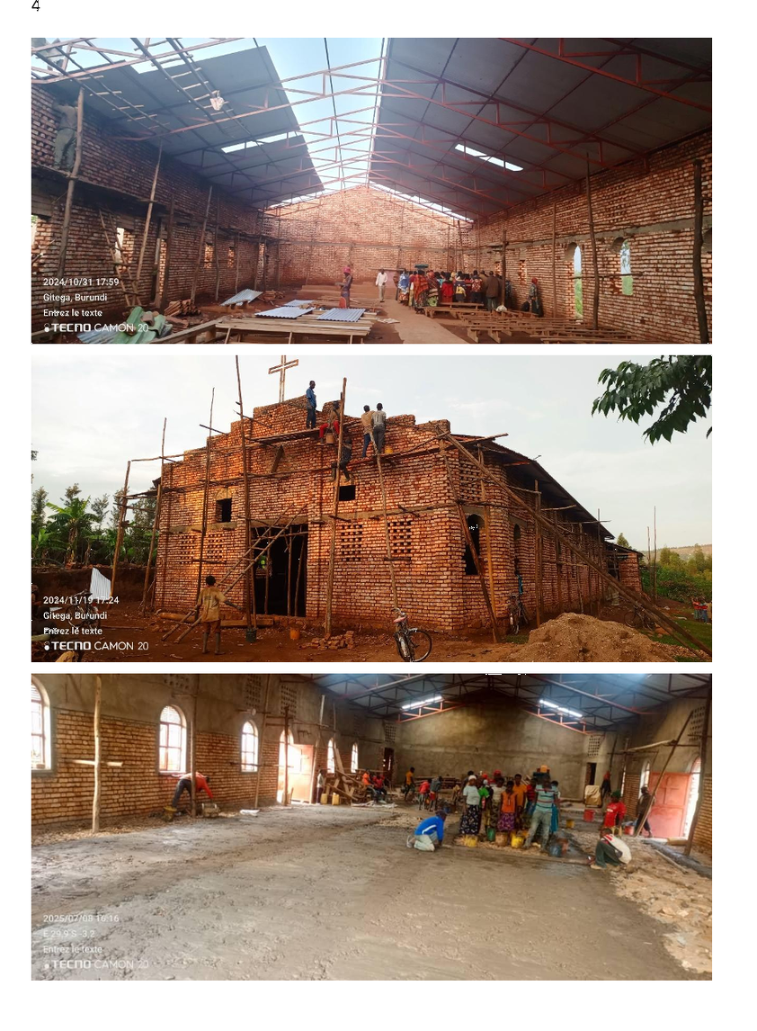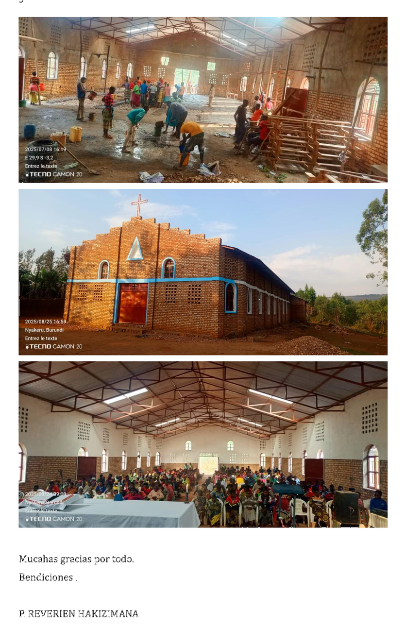 El párroco en 2022 (actualmente en Valencia par a estudios de Derecho Canónico) D. Reverien Hakizimana ha enviado una carta de agradecimiento y también unas fotos de la evolución de las obras de construcción de la iglesia, desde la finca elegida hasta su construcción final, que terminó el pasado 23 de agosto de 2025.